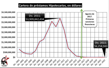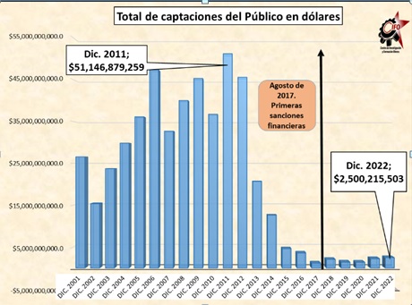 La insuficiencia monetaria resultante de las políticas antes descritas, deriva en una asfixia financiera que impide el devenir financiero mínimo requerido para que la economía pueda empezar a deslastrarse de la crisis. Si hablamos de las captaciones bancarias totales del público, nos damos cuenta que el desplome ha sido de un -95,11 %, entre 2011 y 2022. Si hacemos una comparación, aún más larga, notamos que la reducción en este indicador fue de -90,58 %, entre el año 2001 y diciembre de 2022.
