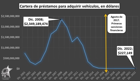El motor, de la alicaída industria venezolana era el ensamblaje de vehículos y la manufactura de autopartes. Ningún otro sector, fuera del extractivo, tenía tan elevada concentración de capitales. En la actualidad dicho rubro es una sombra de lo que fue. El presidente de FAVENPA, Omar Bautista[xii], resaltó que en lo que va de año 2023, 7 empresas han cerrado sus operaciones producto de que el mercado de reposición está muy mermado. Hasta octubre de 2022, se han ensamblado apenas 62 vehículos a los cuales se le añaden míseros 5.000 vehículos importados. Con un sistema financiero tan agobiado, es concebible que no haya préstamos para maquinarías útiles para el ensamblado de vehículos. El asunto más llamativo es que tampoco hay créditos para poder comprar carros, como en cualquier país civilizado. Para adquirir un auto, piden en efectivo (o transferencia), desde 14 mil dólares en adelante. Si vemos la estadística correlativa, la reducción en préstamos para vehículos fue de – 99,98 %, para el período 2011 a 2022. La cartera total de créditos para vehículos equivale a apenas 16 carros de 14 mil dólares cada uno.