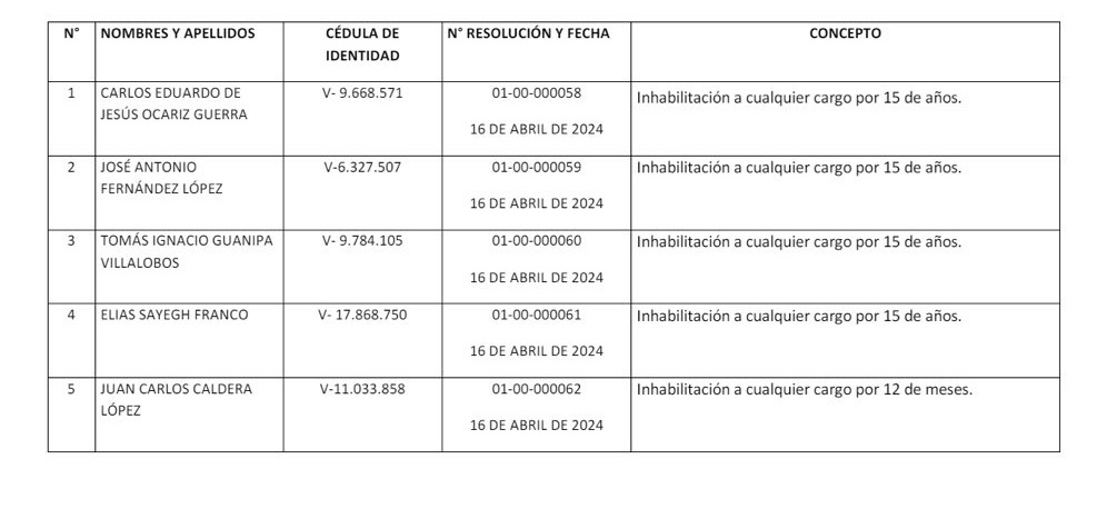 Este miércoles se dió a conocer la inhabilitación de cinco políticos a través de la página web de la Contraloría General de la República. La lista está integrada por Carlos Eduardo Ocariz, José Antonio Fernández, Tomás Ignacio Guanipa, Elías Sayegh y Juan Carlos Caldera. La inhabilitación contempla cualquier cargo público por 15 años, a excepción de Caldera que fue suspendido por 12 meses.