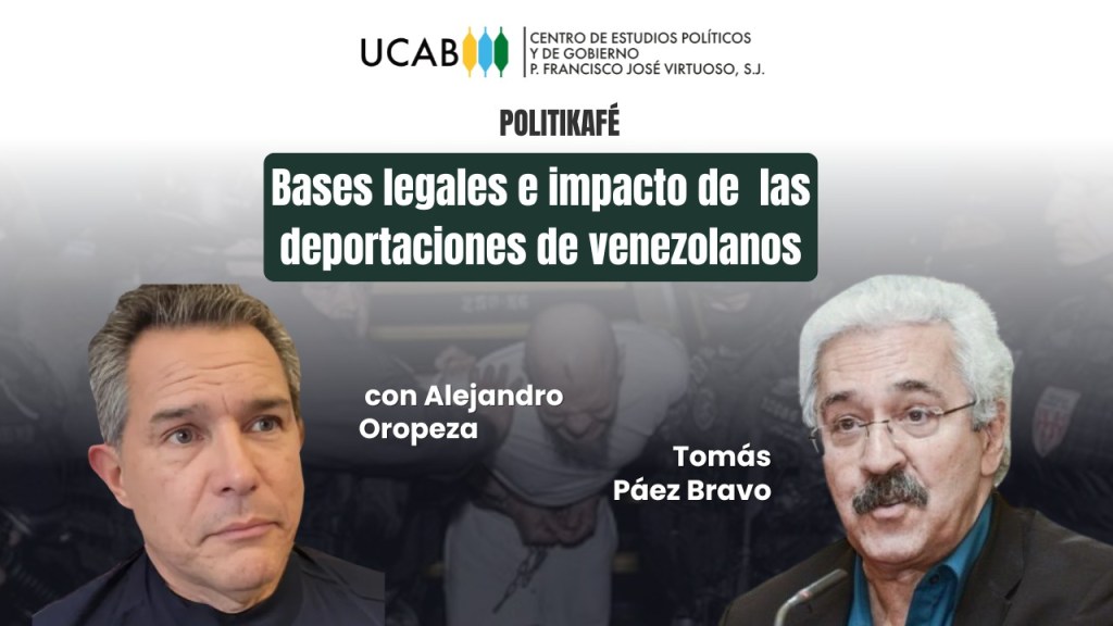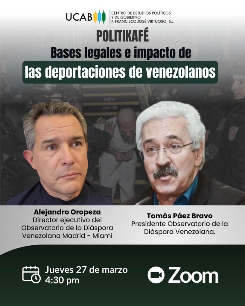 El Centro de Estudios Políticos y de Gobierno «Padre Francisco José Virtuoso S.J.» de la Universidad Católica Andrés Bello, invita este jueves 27 de marzo su foro Politikafé, en línea, para examinar las bases legales e impacto de las deportaciones de venezolanos desde estados Unidos.